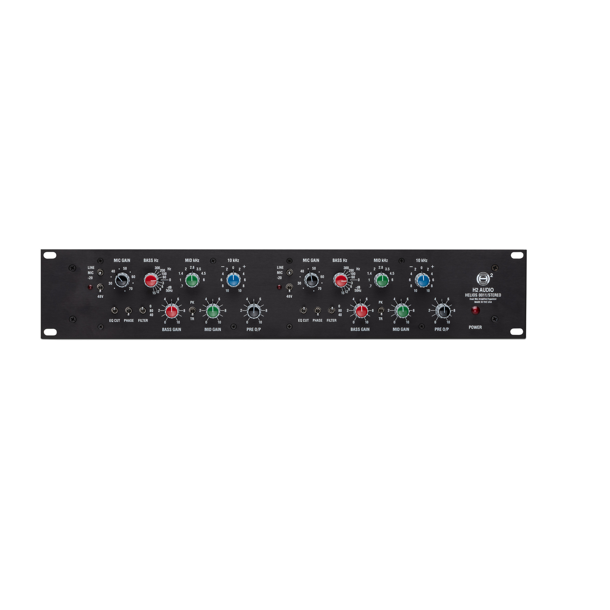 The H2 Audio 0011/Stereo takes everything that makes the original Helios 0011 legendary and doubles it. Packed into a rugged 19” rackmount chassis, this unit houses two complete 0011 mic pre/EQ channels — giving you the perfect tool for stereo tracking, dual mono setups, or mix bus shaping.