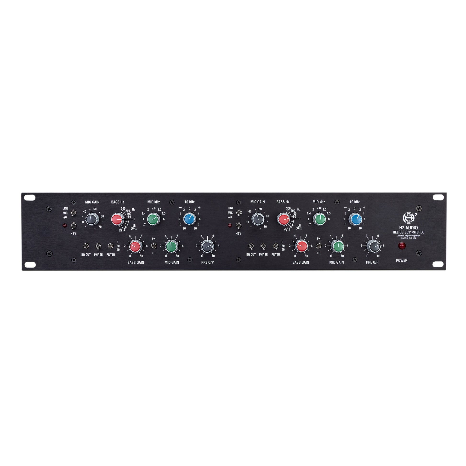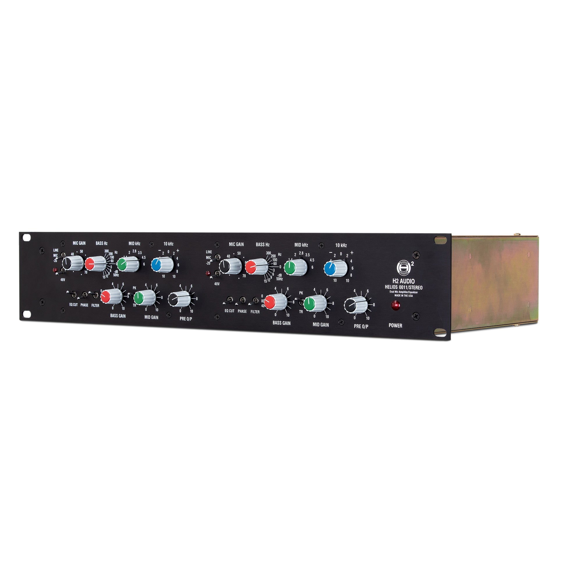 - Two Channels of Helios HeritageDual 0011 mic pre/EQ circuits in a single 2U rack — ideal for stereo sources or parallel processing.